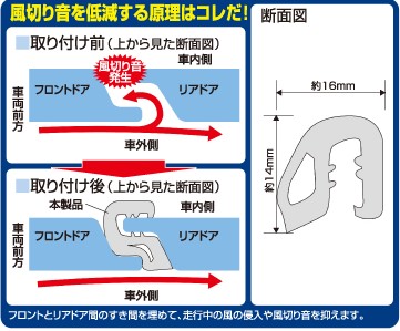 風切り音低減モールはセンターピラー付近の隙間を埋めるのに対し、