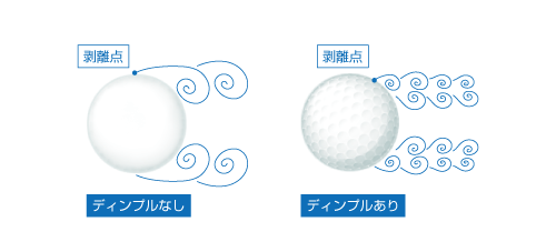 ゴルフボールの凸凹のことをディンプルと呼ぶが、このディンプルは「境界層剥離」を制御するために設けられている。