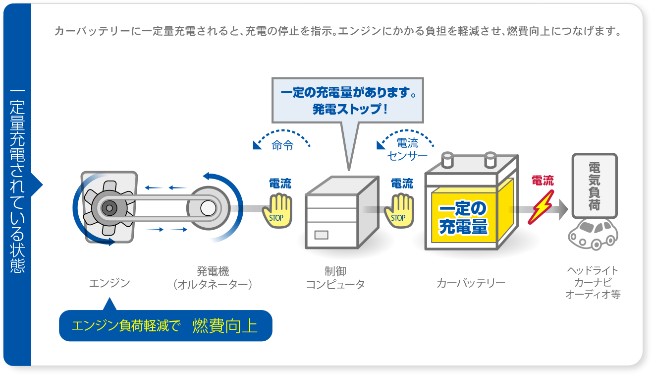 十分充電されているときは、制御コンピュータから「バッテリーの充電は十分できた、今すぐ発電をやめろ!」という命令が下され、発電機であるオルタネーターの稼働をストップさせる。