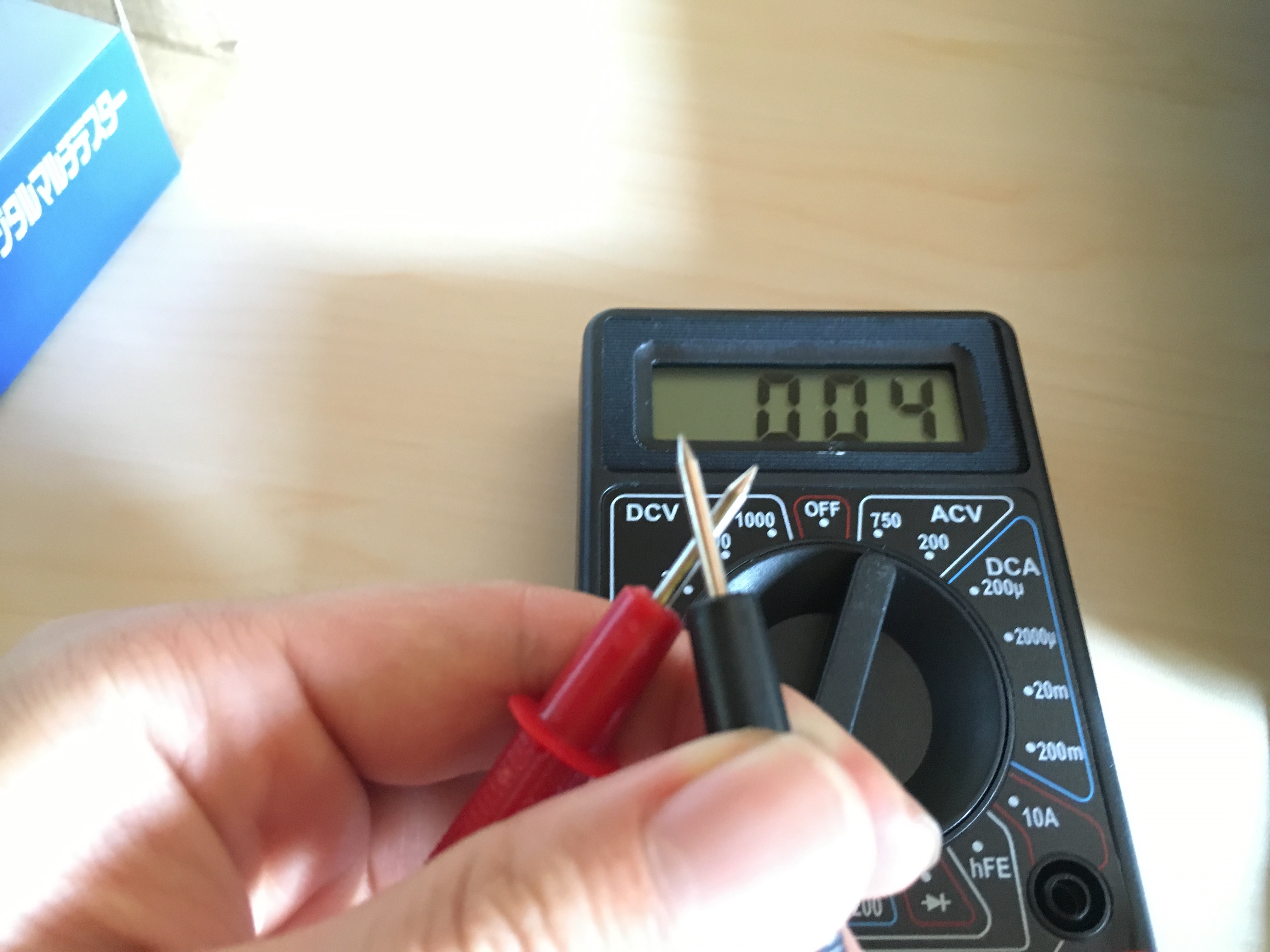 以降設定は変えずに測定した。赤と黒の線を接触させると、004という値が出た。