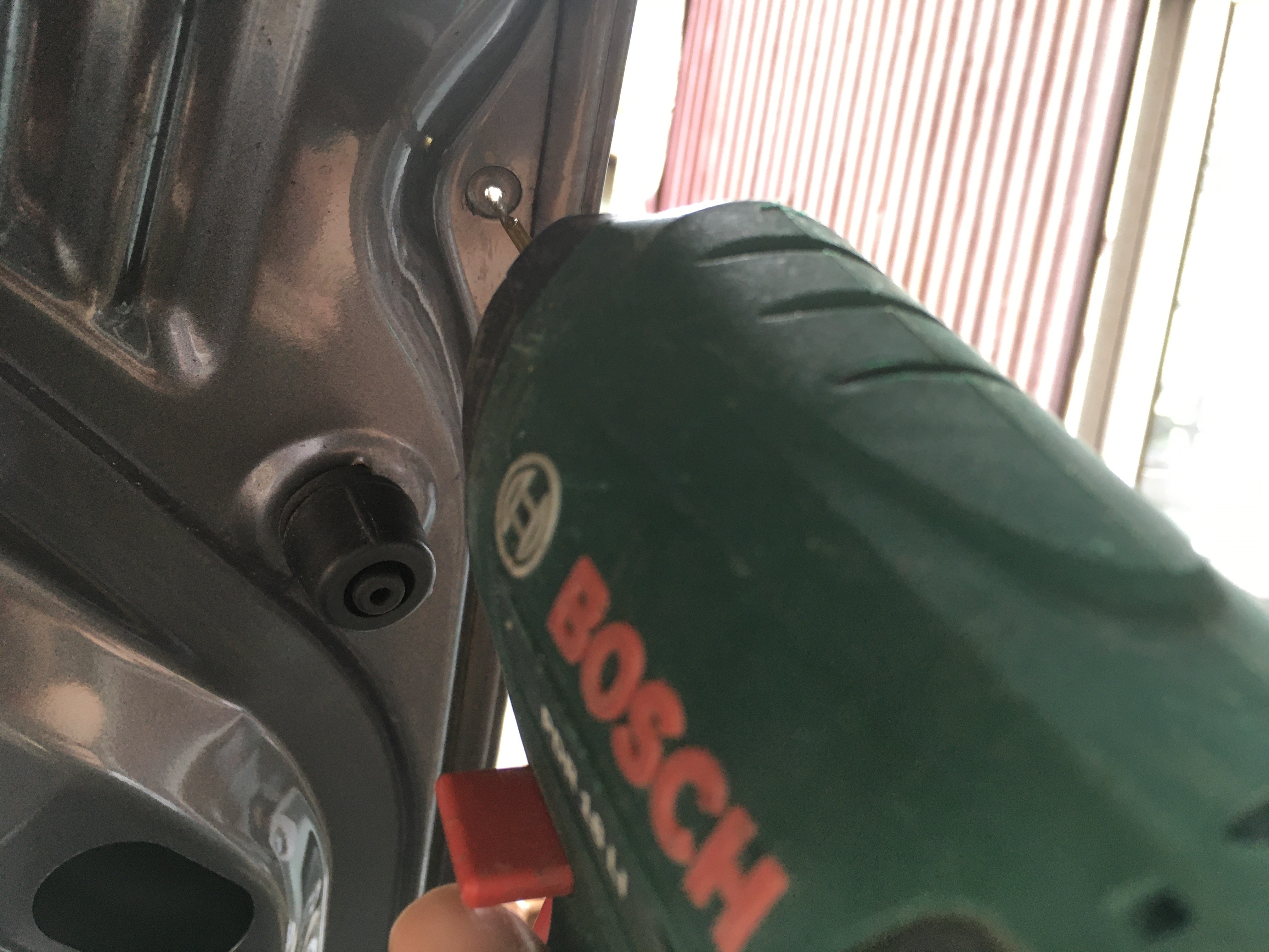 無限リアウイングの取り付けは、片側1か所トランクにドリルで穴開けするだけであり、穴開け位置もわかりやすい。