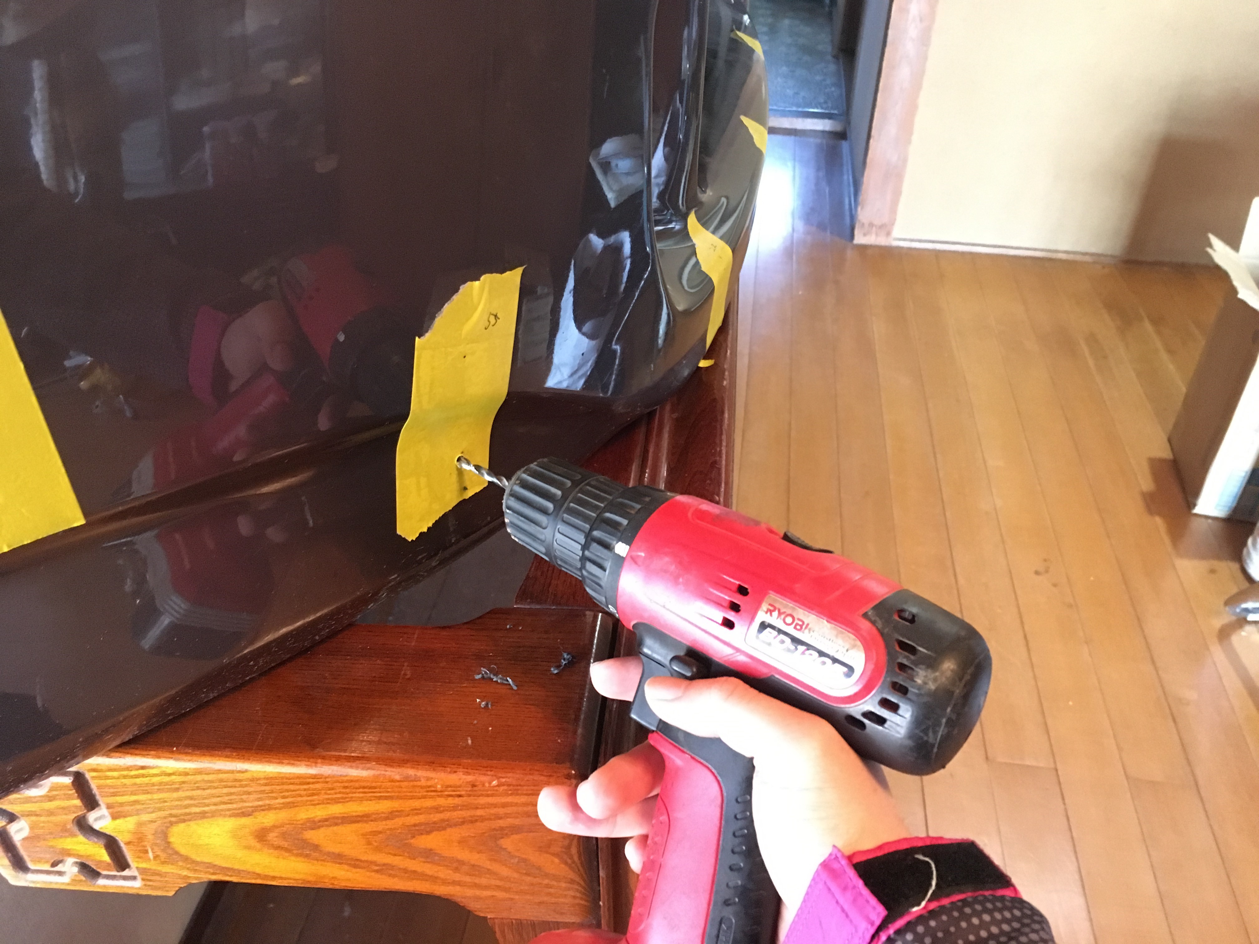 最初に下穴を開けてから、固定用の穴(9.5mm)の穴をドリルで開けよう。
